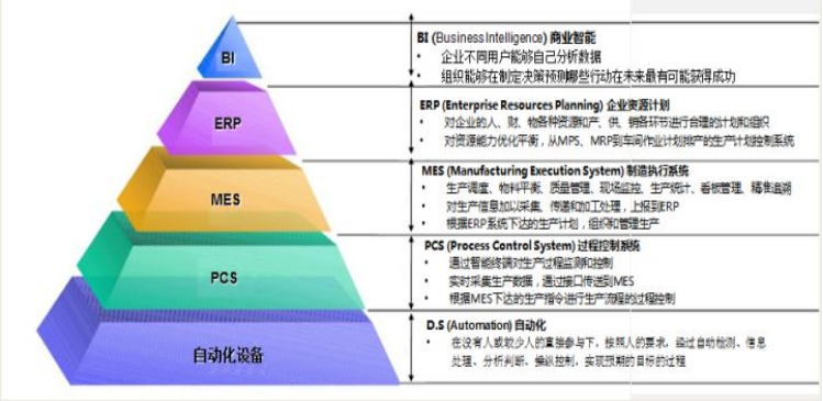 制造執(zhí)行系統(tǒng) (manufacturing execution system, 簡(jiǎn)稱MES)旨在加強(qiáng)MRP計(jì)劃的執(zhí)行功能,把MRP計(jì)劃同車間作業(yè)現(xiàn)場(chǎng)控制,通過(guò)執(zhí)行系統(tǒng)聯(lián)系起來(lái)。這里的現(xiàn)場(chǎng)控制包括PLC程控器、數(shù)據(jù)采集器、條型碼、各種計(jì)量及檢測(cè)儀器、機(jī)械手等。制造執(zhí)行系統(tǒng)MES能夠幫助企業(yè)實(shí)現(xiàn)生產(chǎn)計(jì)劃管理、生產(chǎn)過(guò)程控制、產(chǎn)品質(zhì)量管理、車間庫(kù)存管理、項(xiàng)目看板管理等,提高企業(yè)制造執(zhí)行能力。  企業(yè)信息化四層架構(gòu)體系 MESA(制造執(zhí)行系統(tǒng)協(xié)會(huì))提出的MES功能組件和集成模型包括11個(gè)功能,最初定義MES的時(shí)候提出,只要具備功能之中的某一個(gè)或幾個(gè)也屬M(fèi)ES系列的單一功能產(chǎn)品,正是因?yàn)檫@樣的定義,引發(fā)了諸多的矛盾和尷尬。  MESA定義的MES應(yīng)用功能集成模型 自動(dòng)化生產(chǎn)廠家由于具有先天的對(duì)設(shè)備、網(wǎng)絡(luò)的理解和基礎(chǔ)研發(fā)能力使得他們?cè)跀?shù)據(jù)采集方面如魚得水,而對(duì)于管理理論、管理方法輕車熟路的ERP廠商,卻對(duì)現(xiàn)場(chǎng)控制系統(tǒng)、數(shù)據(jù)采集,有著與生俱來(lái)的生疏和規(guī)避。隨著智能工廠的深入建設(shè),對(duì)于MES的要求提出更高的要求,MES不僅與ERP集成,還要求與控制系統(tǒng)進(jìn)行集成;不僅要求進(jìn)行數(shù)據(jù)采集,還希望實(shí)現(xiàn)控制參數(shù)、工藝標(biāo)準(zhǔn)的下達(dá)。這也對(duì)自動(dòng)化設(shè)備提供商和ERP廠商都提出很大的挑戰(zhàn),企業(yè)資源數(shù)據(jù)來(lái)源于工廠的多個(gè)角度,如工藝資源、制造資源、流程節(jié)點(diǎn)等等正是自動(dòng)化設(shè)備廠商認(rèn)知盲區(qū),由于兩方各不相讓造成目前智能工廠雖然發(fā)展多年依然發(fā)展緩慢或者產(chǎn)業(yè)規(guī)模根本就沒有起色的真正原因。 重新定義制造執(zhí)行系統(tǒng)功能要素: 1.**車間資源管理**:車間資源是車間制造生產(chǎn)的基礎(chǔ),也是MES系統(tǒng)運(yùn)行的基礎(chǔ),車間資源管理主要對(duì)車間人員、設(shè)備、工裝、物料和工時(shí)等進(jìn)行管理,保證生產(chǎn)正常進(jìn)行,并提供資源使用情況的歷史記錄和實(shí)時(shí)狀態(tài)信息。 2.**生產(chǎn)任務(wù)管理**:包括生產(chǎn)任務(wù)接收與管理、任務(wù)進(jìn)度展示和任務(wù)查詢等功能。提供所有項(xiàng)目信息,查詢指定項(xiàng)目,并展示項(xiàng)目的全部生產(chǎn)周期及完成情況。提供生產(chǎn)進(jìn)度展示,以日、周和月等展示本日、本周和本月的任務(wù),并以顏色區(qū)分任務(wù)所處階段,對(duì)項(xiàng)目任務(wù)時(shí)時(shí)跟蹤。 3.**車間計(jì)劃與排產(chǎn)**:高級(jí)排產(chǎn)工具(APS)結(jié)合車間資源實(shí)時(shí)負(fù)荷情況和現(xiàn)有計(jì)劃執(zhí)行進(jìn)度,能力平衡后形成優(yōu)化的詳細(xì)排產(chǎn)計(jì)劃,提高計(jì)劃員排產(chǎn)效率和生產(chǎn)計(jì)劃準(zhǔn)確性是優(yōu)化生產(chǎn)流程以及改進(jìn)生產(chǎn)管理水平; 4.**物料跟蹤**:通過(guò)條碼技術(shù)對(duì)生產(chǎn)過(guò)程中的物流進(jìn)行管理和追蹤,物料在生產(chǎn)過(guò)程中,通過(guò)條碼掃描跟蹤物料在線狀態(tài),監(jiān)控物料流轉(zhuǎn)過(guò)程,保證物料在車間生產(chǎn)過(guò)程中快速高效流轉(zhuǎn),并可隨時(shí)查詢。 5.**質(zhì)量管理**:生產(chǎn)制造過(guò)程的工序檢驗(yàn)與產(chǎn)品質(zhì)量管理,能夠?qū)崿F(xiàn)對(duì)工序檢驗(yàn)與產(chǎn)品質(zhì)量過(guò)程追溯,對(duì)不合格品以及整改過(guò)程進(jìn)行嚴(yán)格控制。其功能包括:實(shí)現(xiàn)生產(chǎn)過(guò)程關(guān)鍵要素的全面記錄以及完備的質(zhì)量追溯,準(zhǔn)確統(tǒng)計(jì)產(chǎn)品的合格率和不合格率,為質(zhì)量改進(jìn)提供量化指標(biāo)。根據(jù)產(chǎn)品質(zhì)量分析結(jié)果,對(duì)出廠產(chǎn)品進(jìn)行預(yù)防性維護(hù) 6.**生產(chǎn)過(guò)程管理**:生產(chǎn)過(guò)程中采用條碼、觸摸屏和機(jī)床數(shù)據(jù)采集等多種方式實(shí)時(shí)跟蹤計(jì)劃生產(chǎn)進(jìn)度,生產(chǎn)過(guò)程管理旨在控制生產(chǎn),實(shí)施并執(zhí)行生產(chǎn)調(diào)度,追蹤車間里工作和工件的狀態(tài),對(duì)于當(dāng)前沒有能力加工的工序可以外協(xié)處理。實(shí)現(xiàn)工序派工、工序外協(xié)和齊套等管理功能,可通過(guò)看板實(shí)時(shí)顯示車間現(xiàn)場(chǎng)信息以及任務(wù)進(jìn)展信息等。 7.**生產(chǎn)監(jiān)控**:生產(chǎn)監(jiān)控實(shí)現(xiàn)從生產(chǎn)計(jì)劃進(jìn)度和設(shè)備運(yùn)轉(zhuǎn)情況等多維度對(duì)生產(chǎn)過(guò)程進(jìn)行監(jiān)控,實(shí)現(xiàn)對(duì)車間報(bào)警信息的管理,包括設(shè)備故障、人員缺勤、質(zhì)量及其他原因的報(bào)警信息,及時(shí)發(fā)現(xiàn)問題、匯報(bào)問題并處理問題,從而保證生產(chǎn)過(guò)程順利進(jìn)行并受控; 8.**統(tǒng)計(jì)分析**:能夠?qū)ιa(chǎn)過(guò)程中產(chǎn)生的數(shù)據(jù)進(jìn)行統(tǒng)計(jì)查詢,分析后形成報(bào)表,為后續(xù)工作